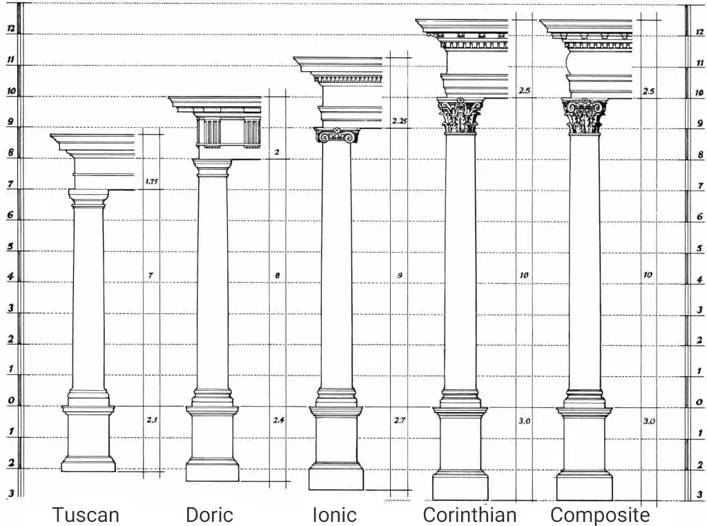 The visual language of classical architecture is organized into five canonical orders, each defined by its column and entablature proportions: